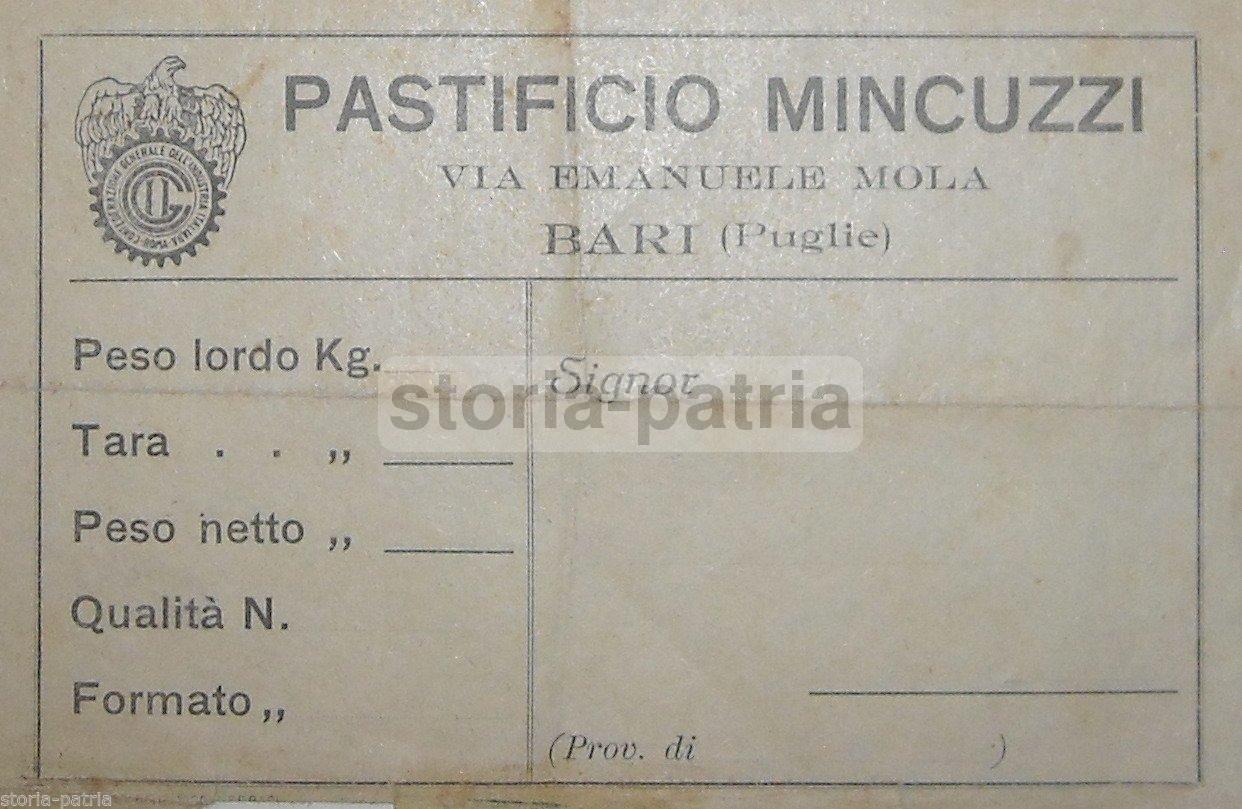 Puglia, Bari, Pubblicitaria d'Epoca, Pastificio, Molino, Pasta, Minguzzi, Etichetta